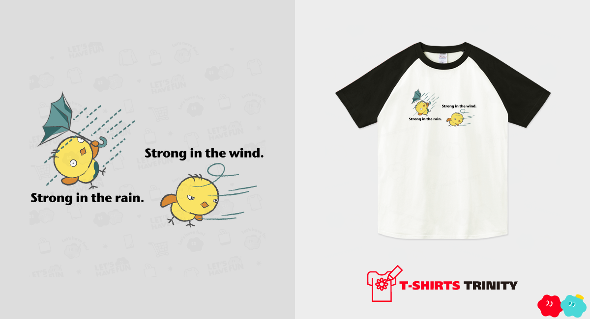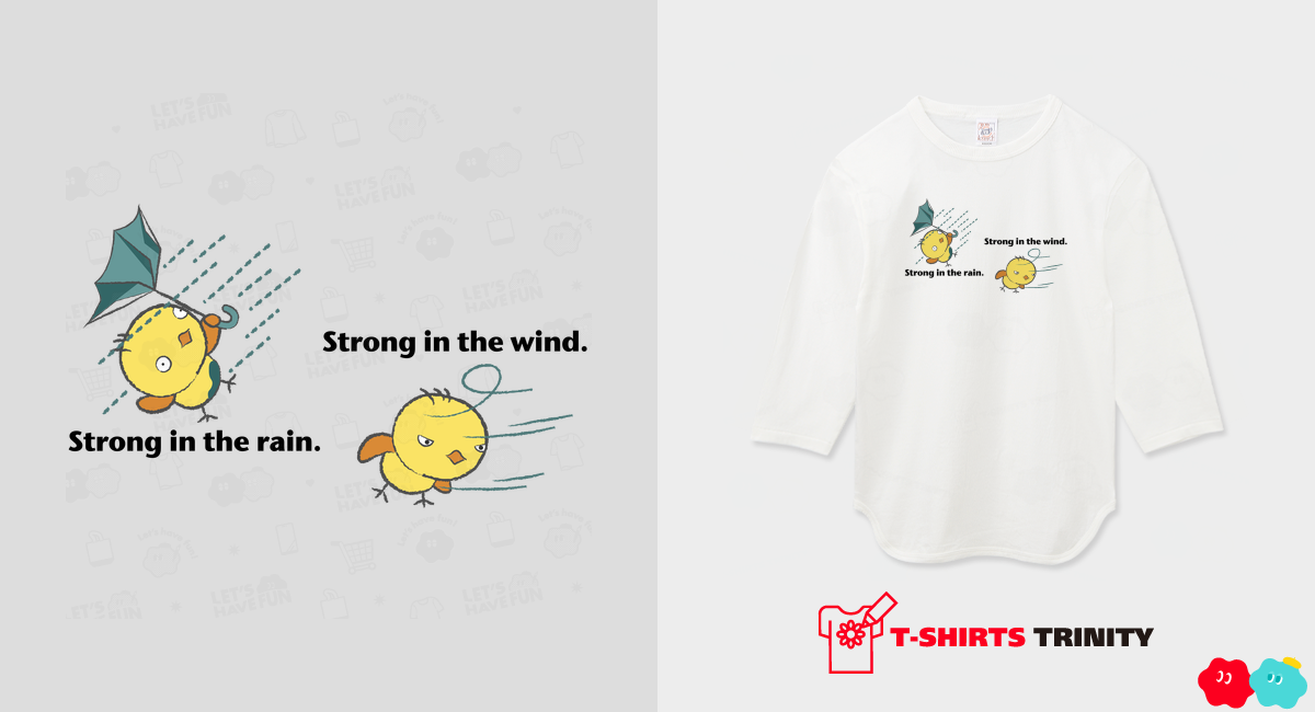 以前、強風に立ち向かうひよこイラストを描いていたのを思い出し、雨ニモマケズ風ニモマケズTシャツにしてみた。