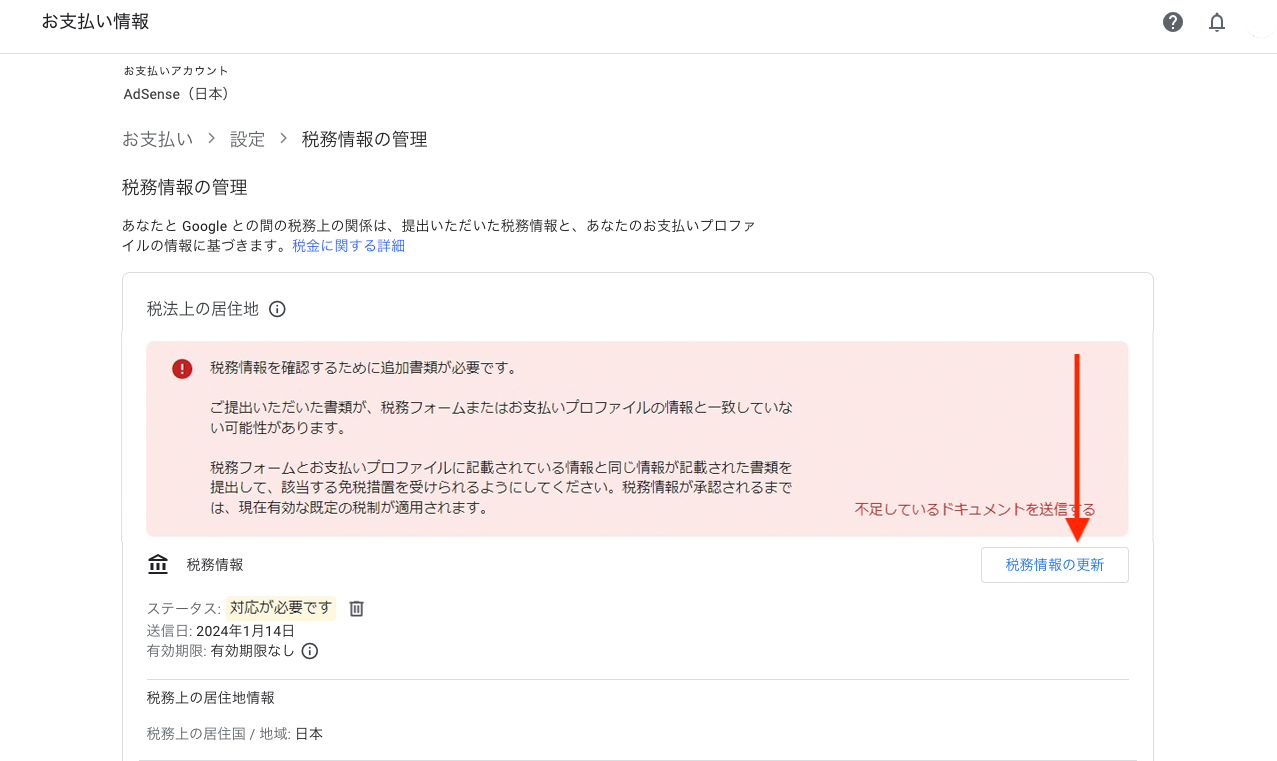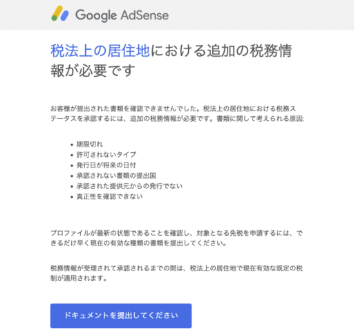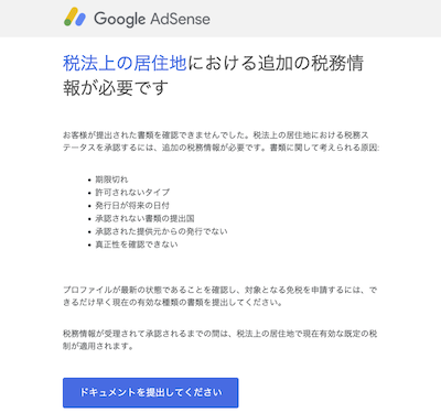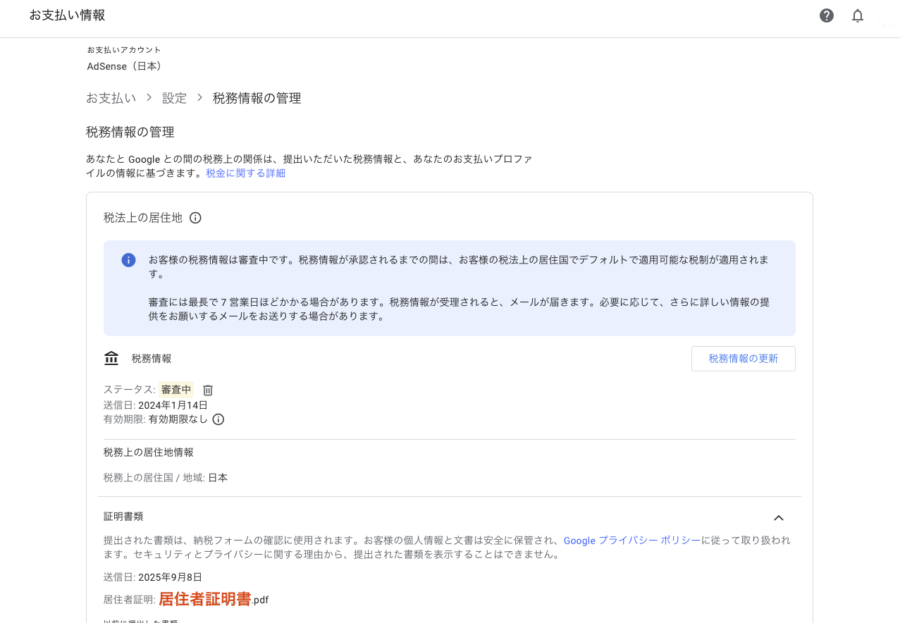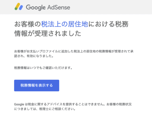 「居住者証明書」のpdfを送信した約1時間後に、Google Payments(AdSense)から「お客様の税法上の居住地における税務情報が受理されました」メールが来た。