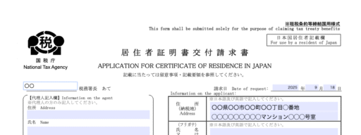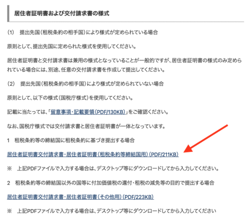 国税庁の該当ページから、「居住者証明書交付請求書・居住者証明書(租税条約等締結国用)(PDF/211KB)」をクリックし、